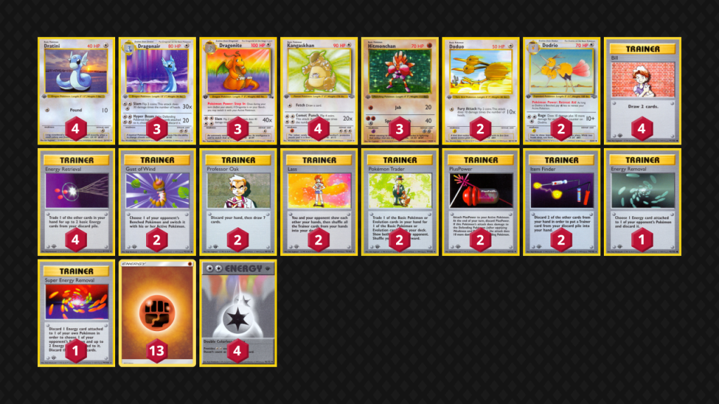 I didn’t intend for this article to be in alphabetical order, but we’re already here so let’s move on to B, for Big Stepper (or Dragonite)! This is something I would call a “casually-competitive” deck, since the deck was originally designed to fight and beat the boogeyman of the format, PsyStall. Though its slow pace and low consistency cause it to struggle with the rest of the metagame. Turbo decks like Blastoise can run you off the board while you’re still trying to set up and your only answers to fighting resistant Pokémon (such as Articuno) all require 4 energy and some coin flips. Competitively this deck isn’t a good place to be, however in more casual environments, the deck actually thrives.