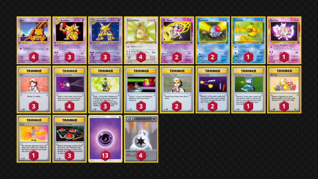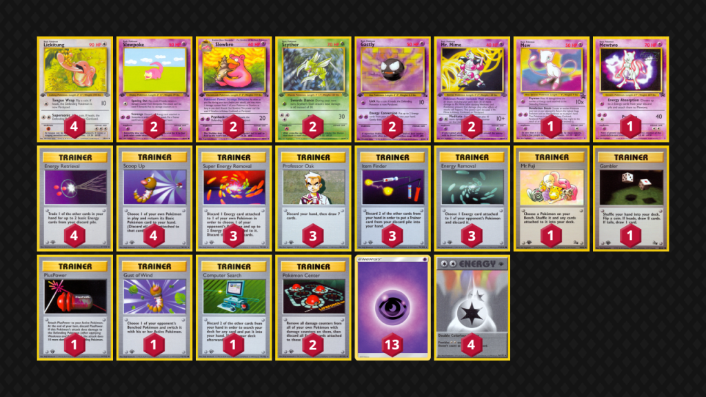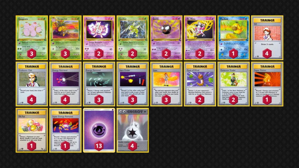 (“Midrange Mode” refers to playing the deck on plan B, that is, using Gastly & Mewtwo to recover energy cards, or using Mr.Mime’s Invisible Wall to buy time. You can also use Psyduck’s Headache attack to lock opponents out of their own Mr.Fuji and/or Gambler after using your own Mr.Fuji to shuffle an energy-full Pokémon back into the deck, though more often you’ll use the Headache attack to keep (Super) Energy Removals at bay while slowly building up Energy on your Exeggutor.) This decklist was finalized on 11/5/2025