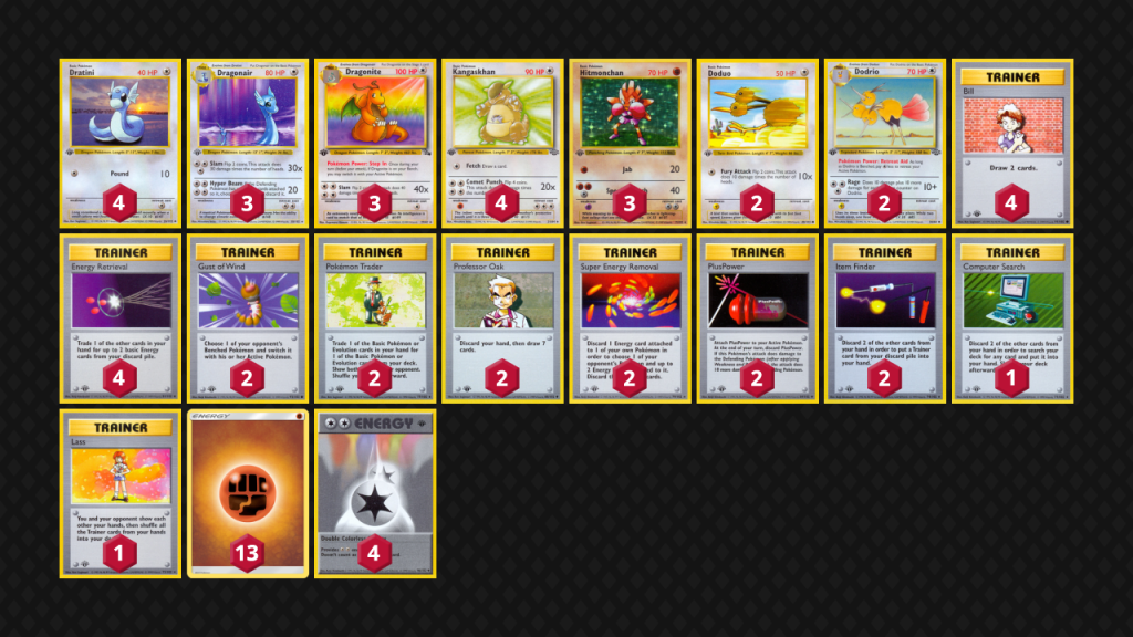 I didn’t intend for this article to be in alphabetical order, but we’re already here so let’s move on to B, for Big Stepper (or Dragonite)! This is something I would call a “casually-competitive” deck, since the deck was originally designed to fight and beat the boogeyman of the format, PsyStall. Though its slow pace and low consistency cause it to struggle with the rest of the metagame. Turbo decks like Blastoise can run you off the board while you’re still trying to set up and your only answers to fighting resistant Pokémon (such as Articuno) all require 4 energy and some coin flips. Competitively this deck isn’t a good place to be, however in more casual environments, the deck actually thrives.