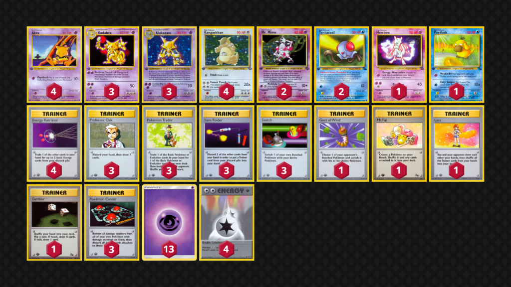 (“Midrange Mode” refers to playing the deck on plan B, that is, using Gastly & Mewtwo to recover energy cards, or using Mr.Mime’s Invisible Wall to buy time. You can also use Psyduck’s Headache attack to lock opponents out of their own Mr.Fuji and/or Gambler after using your own Mr.Fuji to shuffle an energy-full Pokémon back into the deck, though more often you’ll use the Headache attack to keep (Super) Energy Removals at bay while slowly building up Energy on your Exeggutor.) This decklist was finalized on 11/5/2025
